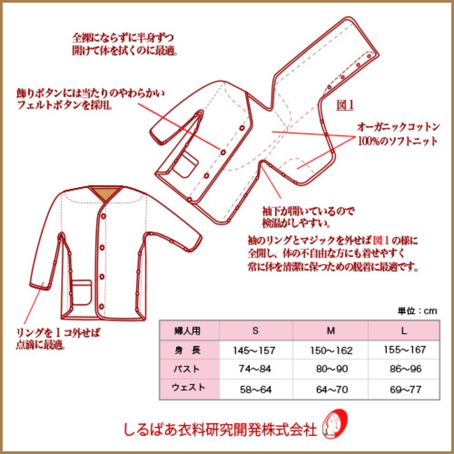 ・フルオープンタイプなのでリング及びマジックテープを外せば点滴時や手術後の浮腫などの場合にもお着替えラクラク!!