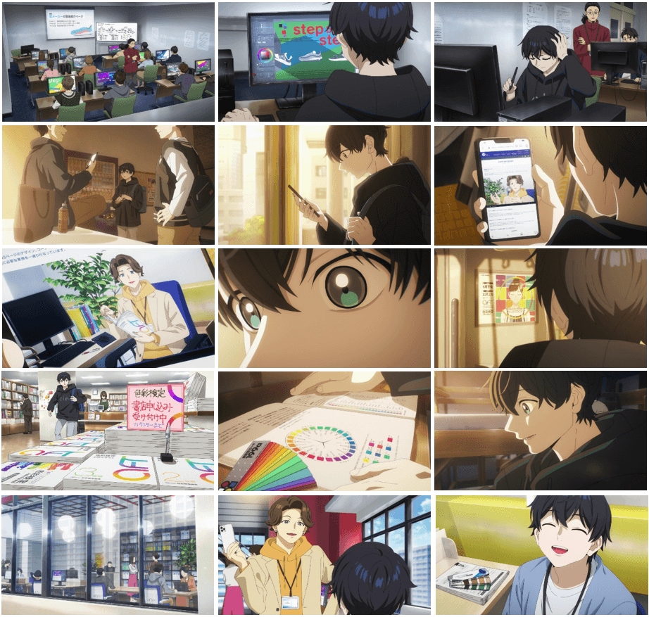 デザイン専門学校に通う主人公、北山 緋彩(きたやま ひいろ)。シーンは商品のホームページをデザインする授業中。美術が得意だからと入学したものの、思うように上手くはいかない様子。「自分に何が足りないのかもわからない…」頭を抱える緋彩。追い打ちをかけるように、焦りと不安を煽り立てる就活の波が訪れる。電車に揺られながら就活サイトをなんとなく見漁り、適当に押した企業のサイトに目が留まった緋彩は、サイトをデザインした社員のインタビュー動画を開く。「(デザインが)面白くなったのは、色を学んでからです。確実な知識が土台にあることで迷いなく一歩が踏み出せて。ただ尻込みしてただけなんですよ」そう語る社員が色彩検定のテキストを持っていることに気づいた緋彩は、電車の扉が開くと同時に一歩を踏み出す。色彩検定のテキストを手に取り、夢中で読み込む緋彩。白紙だったエントリーシートも徐々に埋まっていく。その2年後、緋彩はウェブデザイン会社に勤めていた。「新卒採用のページに社員インタビューを掲載したいんだけど、どうかな?」突然話しかけてきたのはあのインタビューに答えていた社員。緋彩は驚きつつも、笑顔で「はい!僕でよければ!」と答えるのだった。