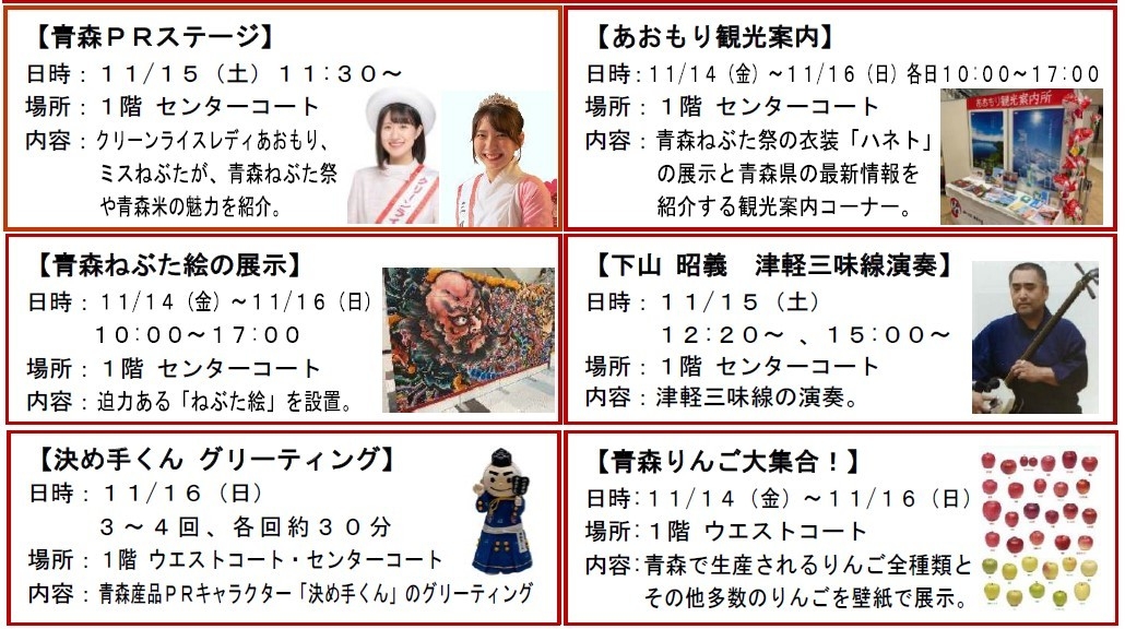 また、青森の観光について、ポスターの掲示や津軽三味線の演奏などステージイベントを実施し魅力をPRします。青森県産品PRキャラター「決め手くん」も登場しフェアを盛り上げます。