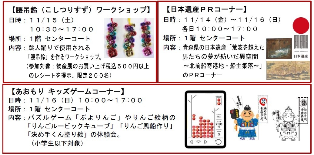 ■実施内容:<特別催事>物産展や特産品を提供するカフェ、観光PRコーナーの設置、迫力ある青森ねぶた絵の展示ブース、「 腰吊鈴作り」体験コーナーやPRイベントなどを開催