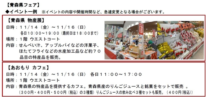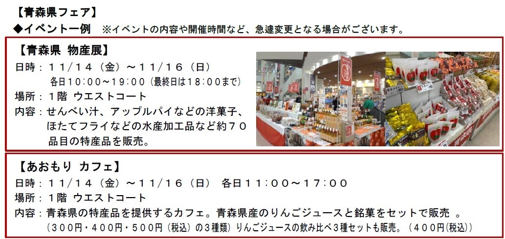 イオンリテール中部カンパニー(以下、当カンパニー)は、11月14日(金)~11月16日(日)までの3日間、イオンモール名古屋茶屋(名古屋市港区)にて、青森県の豊かな食と文化を紹介する「青森県フェア」(以下、当フェア)を開催します。