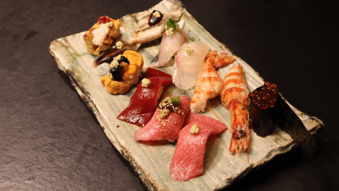 上質な厳選素材を使ったお鮨、遊び心溢れる創作の逸品をご堪能いただけます。京都の漆職人が手掛けた付け台が、鮨を一層艶やかに映えさせます。お座席は、職人技を目前で眺められるカウンター席のみとなっております。