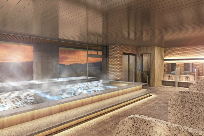 至福の温泉体験をご満喫いただくために、箱根の雄大な自然を一望できる大浴場を新設いたしました。モダンで清潔感あふれる空間には、広々とした内湯とサウナ、水風呂を完備。露天風呂からは空と森がとけ合うような絶景をお楽しみいただけます。