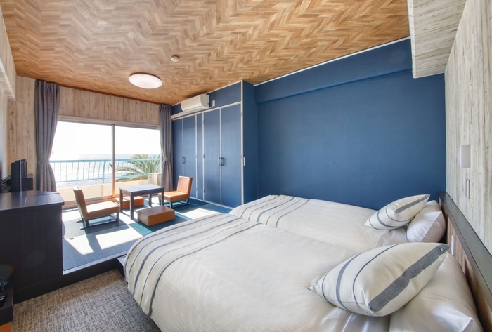 全室オーシャンビューの客室。2023年に全ての客室リニューアルを終了しました。畳スペースにはお布団を敷くことも可能で、潮騒を感じながら寛ぐことのできるお部屋です。ファミリー向けのキッズルームもアリ。