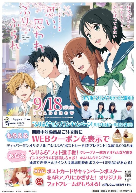 クレープチェーンとして売上日本一(富士経済調べ)の「ディッパーダン」を展開している 株式会社オレンジフードコート(本社:東京都江東区、代表取締役:越智 雅也)は、2020年9月4日(金)より、9月18日(金)ロードショーのアニメーション映画『思い、思われ、ふり、ふられ』応援キャンペーンを開催致します。