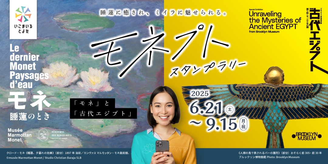 豊田市美術館で開催される「モネ 睡蓮のとき」と、豊田市博物館で開催される「ブルックリン博物館所蔵 特別展古代エジプト」の展覧会がいよいよ愛知県豊田市で始まります!話題のふたつの展覧会の会期に合わせて、オリジナルブックマーク(非売品)や展覧会公式グッズがもらえるスタンプラリーや、展覧会コラボメニューが楽しめるお店など、豊田のまち巡りが楽しめる企画が盛りだくさんでお待ちしております。