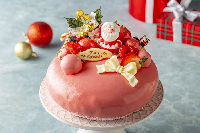 プレゼントを運ぶサンタクロースがツリーにぶつかり、オーナメントが落ちてしまった…そんなストーリーを表現したクリスマスムースケーキです。ベースは、米粉を使用した濃厚でしっとりとしたガトーショコラ。その上に、軽やかなヘーゼルナッツチョコレートのムースを重ね、センターには苺と温州みかんの爽やかなジュレを忍ばせました。温州みかんのジュレが濃厚なチョコレートのアクセントになっています。ケーキのトップには、サイズの異なるピンクのオーナメントがころんと可愛らしく飾られています。大きな球体のオーナメントはケーキと同じヘーゼルナッツチョコレートムース、小さなオーナメントはルビーチョコレートとラズベリーシロップのガナッシュを閉じ込めたチョコレートです。