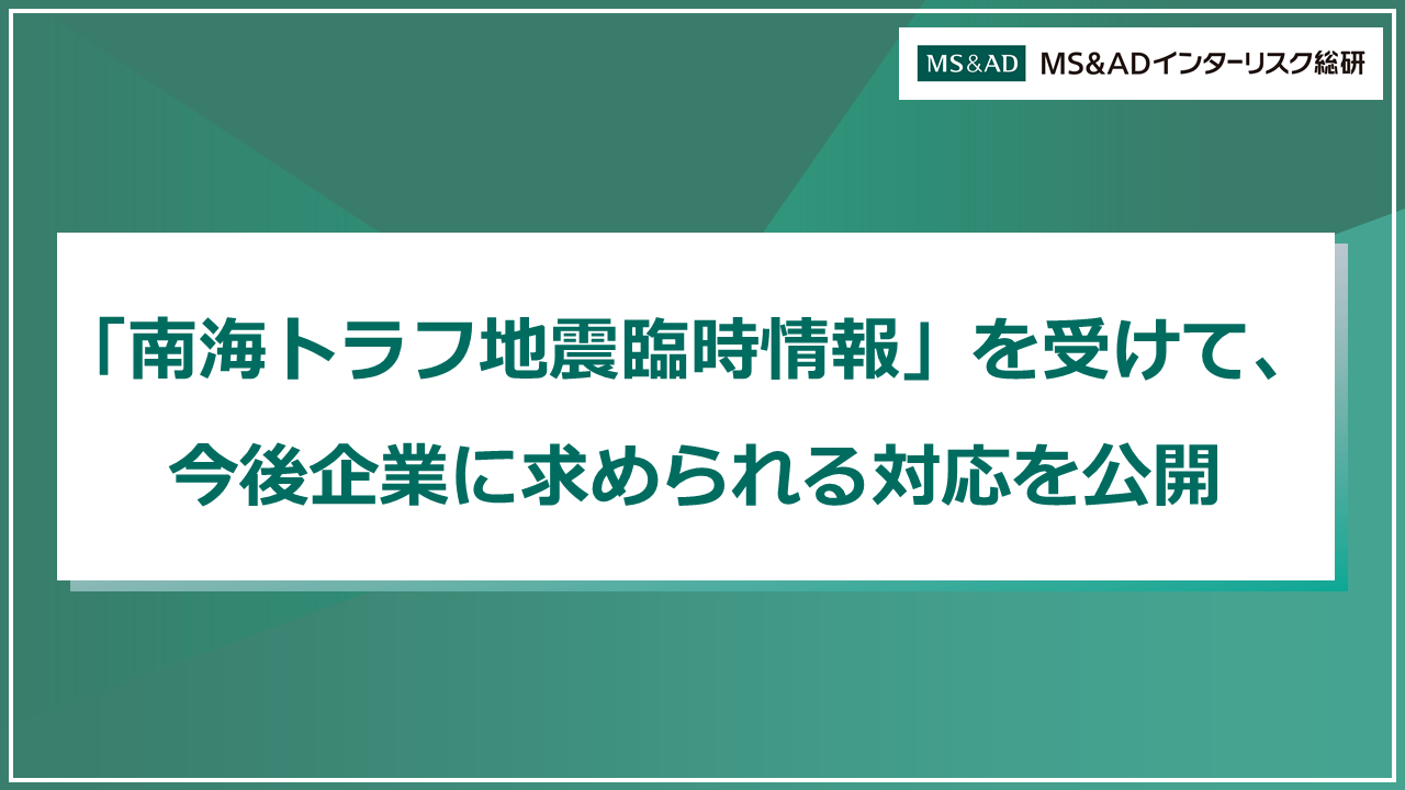 MS&ADインシュアランスグループのMS&ADインターリスク総研株式会社は、2024年8月8日に発生した宮崎県の地震を受け、「南海トラフ地震臨時情報」に関する企業がとるべき対応をまとめた記事を公開しました。