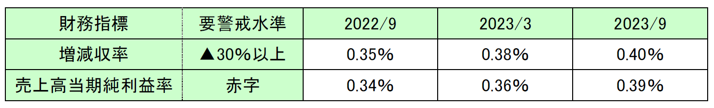 経済環境や景気動向の変化により、倒産のトレンドは常に変化しています。下表のとおり、2022/3から2023/3の1年間で比較しても、各財務指標における要警戒水準の倒産確率も変化が生じていることが分かります。これらの倒産トレンドの変化に対応するために、定期的に倒産実績の集計を行い、格付と倒産確率の乖離が生じないように調整を行っています。