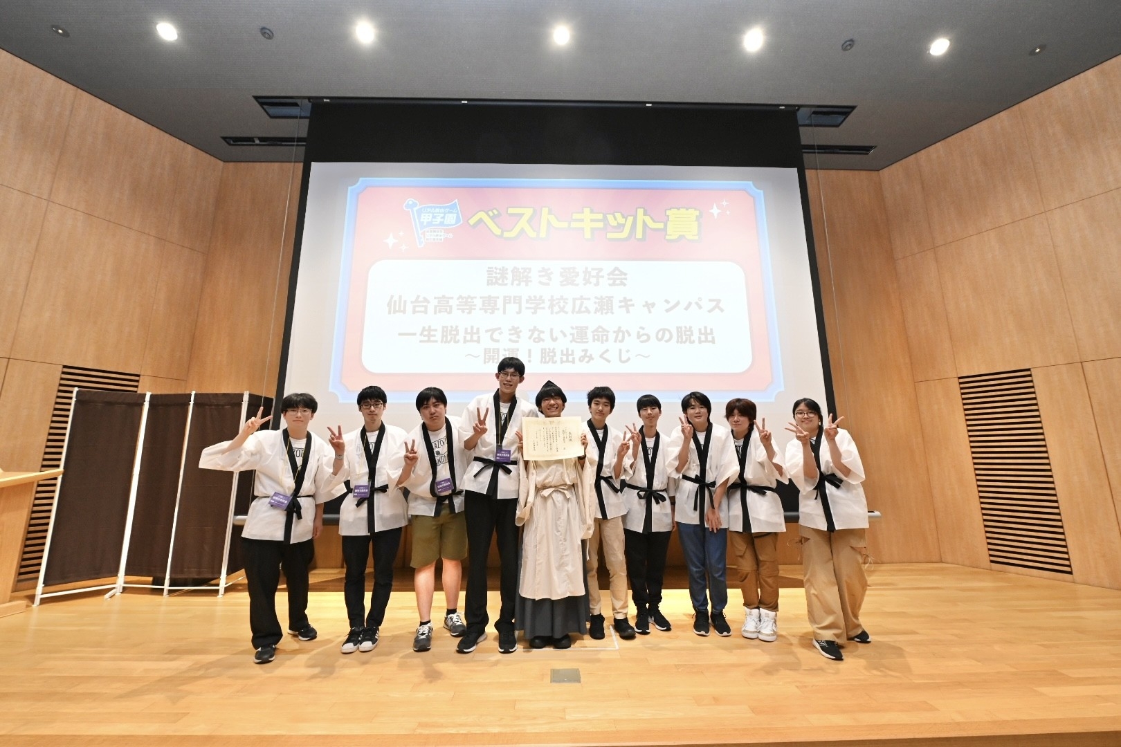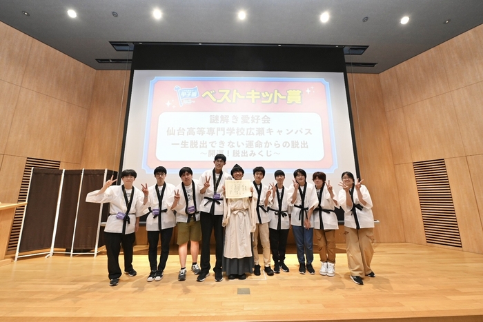 そして、本大会の協賛として各団体の謎解きキットを印刷してくださった竹田印刷株式会社より、本選出場団体の中で最も優れた謎解きキットを制作した団体にベストキット賞が贈られました。ベストキット賞は仙台高等専門学校広瀬キャンパスの「謎解き愛好会」が受賞。「謎解き愛好会」が制作した『一生脱出できない運命からの脱出~開運!脱出みくじ~』は、おみくじをはじめとする謎解きキットの高いデザイン性が評価されての受賞となりました。