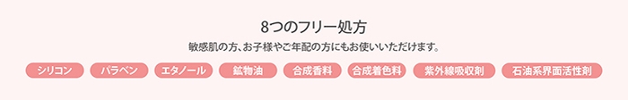 さっぱりとした使用感はそのままに、保湿成分であるホエイを増量し更に潤いを感じられるようになりました。また、敏感肌の方やお子様、ご年配の方にもお使いいただけるよう、パラベンフリー・エタノールフリー・鉱物油フリーなどの8つのフリー処方を実現し、肌への負担を軽減しております。