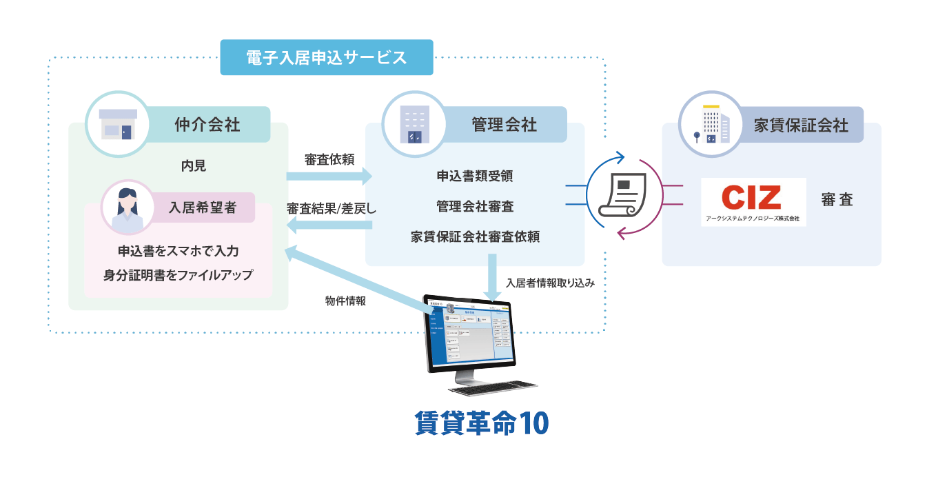 入居申込をオンラインで完結する日本情報クリエイトの「電子入居申込サービス」とアークシステムテクノロジーズが提携を行うことにより、家賃保証サービスをご利用いただく入居希望者様、仲介会社様、管理会社様はこれまでと比較して、手書きでの保証申込書作成の手間や記載漏れの確認などのストレスが少ない、スムーズな保証審査が可能となります。