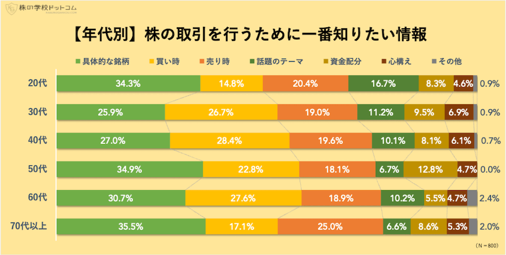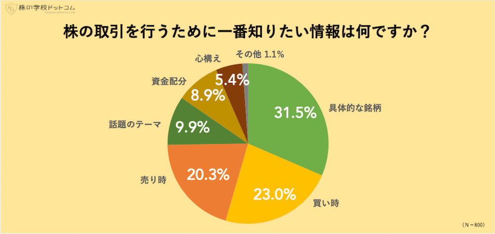 株の取引を行うにあたって、個人投資家が最も知りたいと思っている情報はどんなことか。調査の結果、最も多くの回答数を得たのは「具体的な銘柄」でした。800人のうち3割を超える252人(31.5%)がこの項目を選び、やはり、「どの株を買えばいいのか」という情報が求められていることがわかります。