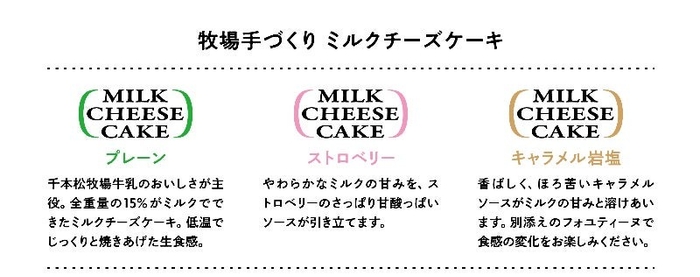このミルクチーズケーキは、自社で飼育している約500頭の乳牛から絞って直ぐの新鮮なミルクを使用し、牧場内の菓子工房で手づくりされており、チーズケーキに使用できる最大量、全体の15%に牧場のミルクを使った、新感覚のミルクチーズケーキです。既存のフレーバー「プレーン」「ストロベリー」と併せて、ぜひご賞味ください。