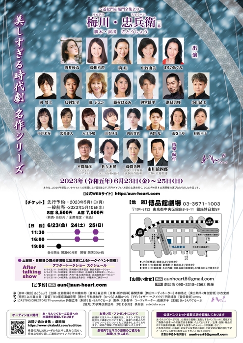 あ・うん♡(ハート)ぐるーぷ制作・主催、『~近松門左衛門全集より~梅川・忠兵衛』が2023年6月23日 (金) ~2023年6月25日 (日)に博品館劇場(東京都中央区銀座8-8-11)にて上演されます。