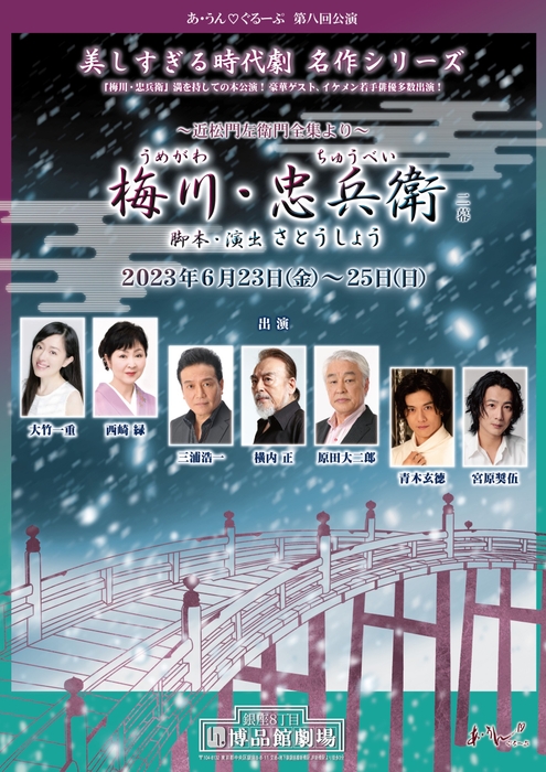2020年5月新型コロナの影響により中止、同年「アートにエールを!」ダイジェスト版の上演を経て、今回、脚本・キャストを一新し、満を持しての本公演です。梅川・忠兵衛は大竹一重と宮原奨伍。特別ゲストの横内 正、原田大二郎、三浦浩一を中心に、イケメン若手俳優やレギュラー女優陣が二人を華やかに盛り上げます。恋の逃避行をする二人の幻想的な場面や廓の女たちの粋で艶やかな衣裳の数々、激しく華麗な立回り、新感覚の「美しすぎる時代劇」あ・うん♡ぐるーぷならではの「梅川忠兵衛」をお楽しみください。