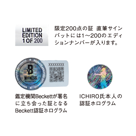 限定200点のエディションナンバー入り。バットには1~200のエディションナンバーが入ります。「Beckett認証ホログラム」と「ICHIROホログラム」付きの本物です。