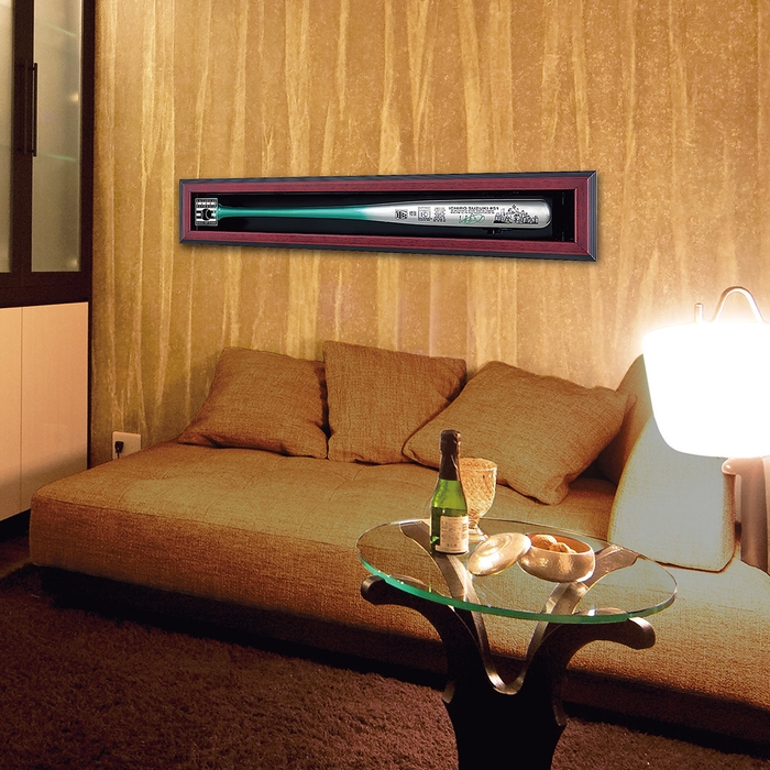 格調高い木製展示額は扉を開けてバットが取り出せるキャビネットタイプです。