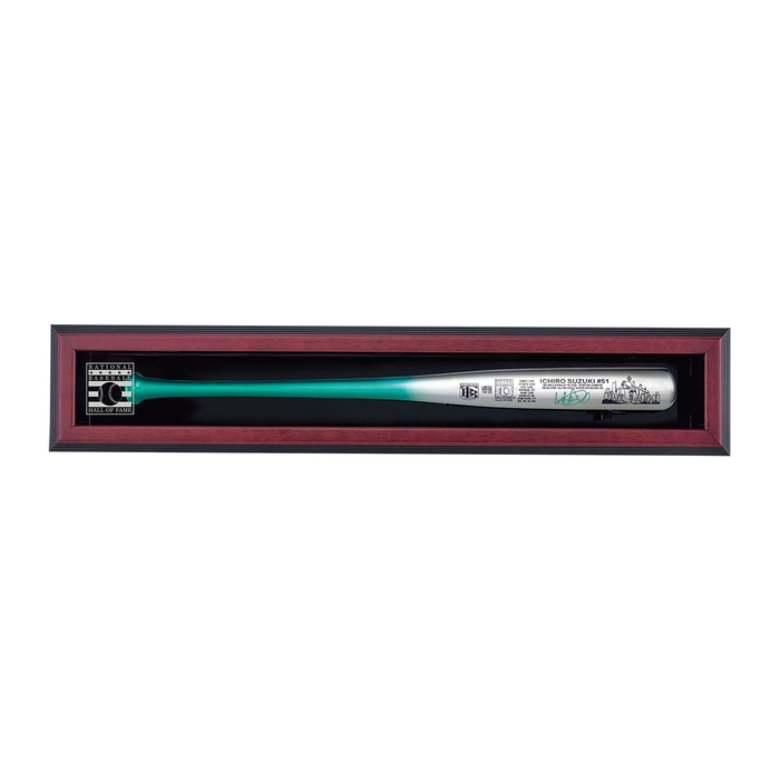 イチロー直筆サインボールと、マリナーズをイメージしたメタリックブルーの記念ボールを並べて特製展示ケースにディスプレーできるスペシャルセット。アメリカ野球殿堂博物館がミラー仕上げの背景に描かれています。