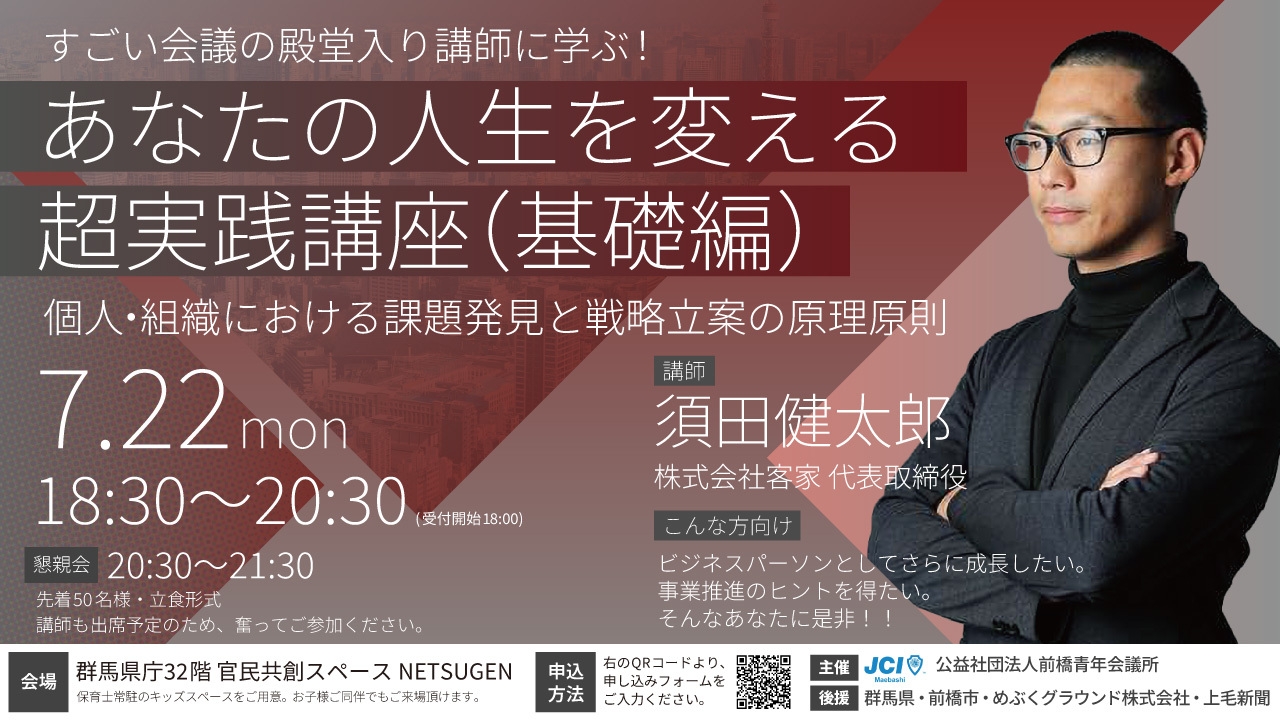 公益社団法人前橋青年会議所(群馬県前橋市日吉町 1-8-1 マックスクエア(前橋商工会議所会館 4F)、理事長:西川 裕志)は、7月例会・「ビジネス交流推進例会」あなたの人生を変える超実践講座(基礎編)を開催致します。