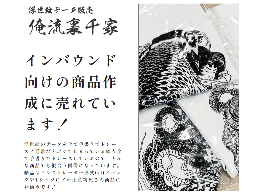 さらに、「俺流裏千家」では、浮世絵データを利用したオリジナルグッズの制作にも個別に対応しています。Tシャツ、バッグ、ポスターなど、1枚からでもリーズナブルな価格で提供し、個人や小規模店舗でも手軽にグッズを制作することが可能です。これにより、オリジナルデザインの魅力を最大限に活かした商品を展開することができます。