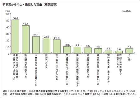 経済産業省中小企業庁の取りまとめた『中小企業白書』では新事業の中止・撤退の理由がまとめられていますが、そのすべての要因が上記3つに集約されていることが見て取れます。