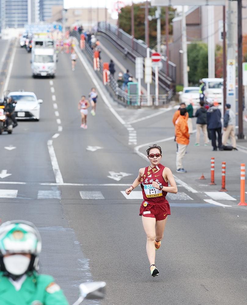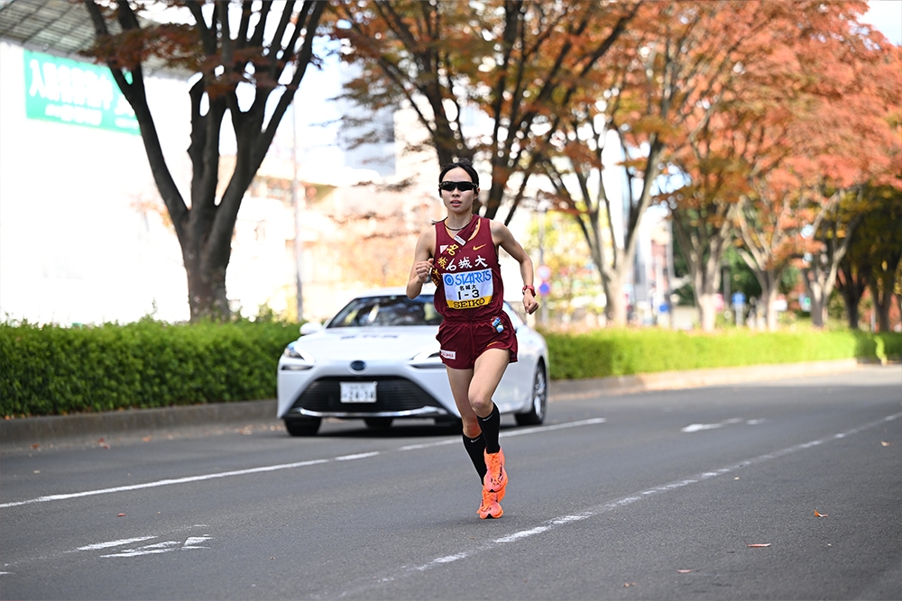 6.6kmの1区は1年生の米澤奈々香選手が任された。今シーズン前半は膝のケガで走れず苦しんだ時期もあったが、10月1日の「Athletics Challenge Cup 2022」(新潟市)の5000mで15分31秒63と自己記録(15分31秒33)に迫るタイムをマークして復調をアピール。準備万端でこの日を迎えていた。スタートの競技場内で早くも先頭に立つと、最初の1kmは3分07秒で通過。先頭争いは序盤から立命館大学の村松結選手(1年)との2人に絞られたが、米澤選手が4km付近でスピードを切り替えて村松選手を突き放した。