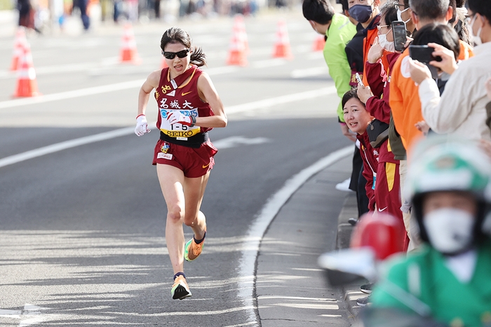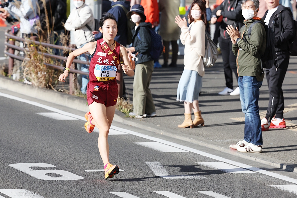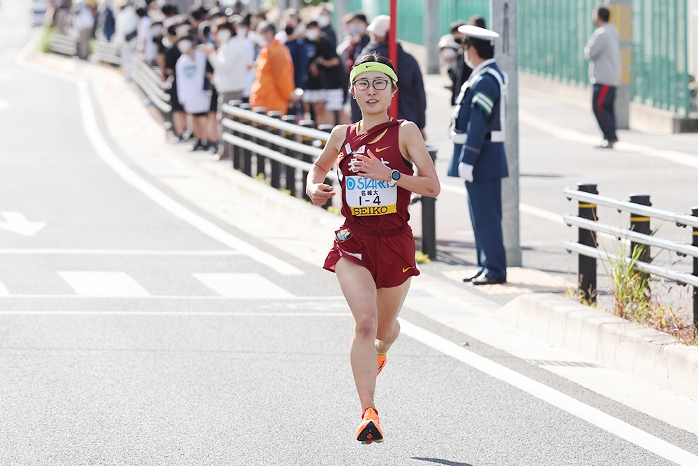 5000mで毎年自己記録を更新し、最終学年では大記録を樹立。米田監督も「理想的なタイムの伸び方」と讃えている。この駅伝でも独走状態のなかで快走し、小林成美選手(4年)が2020年に打ち立てた区間記録に並ぶ21分37秒の区間タイ記録で区間賞を獲得。「狙っていた区間新記録は出せなかったのですが、成美と同じタイムということで、お揃いになってうれしいです」と喜んだ。この区間で後続チームの順位は変動。立命館大学が4位から2位に浮上、日本体育大学が3位、大東文化大学が4位と、往年のライバル校たちがこの区間で順位を上げていたが、名城大学は2位に1分32秒差と大きくリードして次の区間へタスキをつないだ。