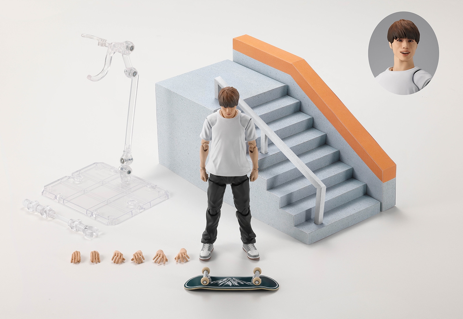もちろんスケートボードも付属。さらにトリック再現等に使用する専用の「魂STAGE」、回転系トリック等の再現にも必須なデッキのジョイントパーツ、交換用の左右手首各3種、ペーパークラフト製のストラクチャーが付属。迫力のあるトリックを繰り広げるストリート競技の再現が可能です。
