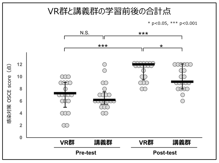 学習前と学習後の点数を比較したところ、VR群、講義群のいずれにおいても、学習後に、手指衛生、エプロン装着、手袋装着、合計点の点数が高くなっており、学習効果を認めた。VR群と講義群の学習後の点数を比較したところ、VR群の方が、講義群より合計点が高く、より学習効果が高い可能性が示唆された。(VR群:7点→12点、講義群:6点→9点)