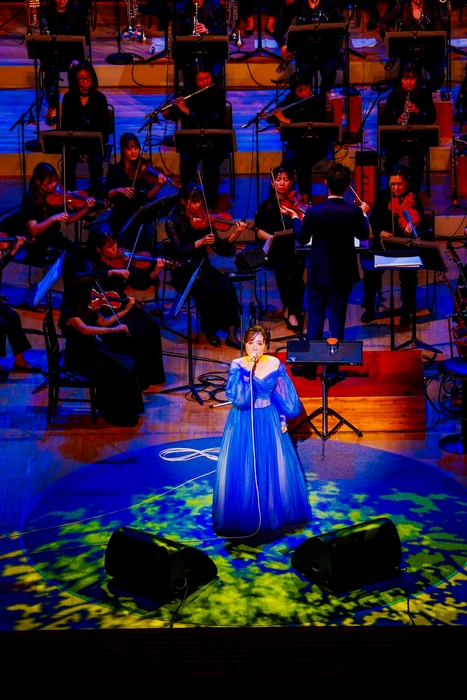 コンサートは静かなピアノ演奏の中、柔らかなブルーの衣裳で登場した平原の『明⽇』の歌唱から始まった。大きな拍手の中、やさしい歌声とハープの音色で始まり、オーケストラの演奏が加わると、温かで重厚感のある空気が客席を包み込む。そのままアイルランド民謡のカバー『Danny Boy』、『ありがとう』、『Don’t Cry』と続き、耳と心に音楽が満ちていくような時間に浸る。歌い終えた平原が客席に「こんばんは!」と声をかけると、観客も「こんばんは!」と返すとうれしそうな笑顔を見せ、「平原綾⾹Jupiter基⾦ の活動に賛同し、来てくださってありがとうございます。今日はみなさんに感謝の気持ち、そして能登半島地震で被災された方々に届けたいと思います。最後まで楽しんでください」と挨拶。ピアノ伴奏で『からっぽのハート』を歌いあげた。