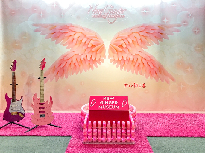 岩下社長、岩下の新生姜ミュージアムが所有するピンク色のギターを、6周年にちなみ6本集合した特別展示。