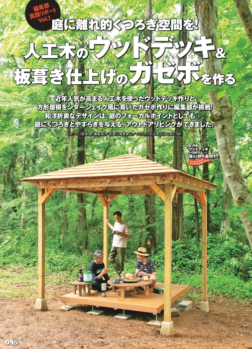 編集部のDIY実践リポートは、今も続くウッドショックの中、その存在感を増してきた人工木を使ったウッドデッキ作りと、継ぎ手を駆使した方形屋根のガゼボ作りの模様をお届け。板葺き仕上げのリゾートライクな“離れ”的くつろぎ空間の作り方をご覧ください。