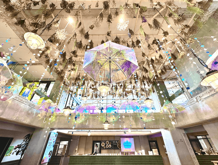 天井には紫陽花にみたてたシャイニーアンブレラが咲き誇ります。