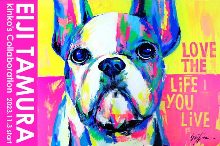 キンコーズ・ジャパン株式会社(本社:東京都港区、代表取締役社長:渡辺 浩基、以下 キンコーズ)は、キンコーズ・渋谷店にて、2023年11月3日(金・祝)~30日(木)まで、ポップなカラーの犬を描くドッグアーティスト(犬絵画・画家)、タムラエイジ氏の「LOVE THE LIFE YOU LIVE」展を開催。店内を装飾でジャックし、原画の展示やキンコーズでしか手に入らないグッズの販売も実施中。