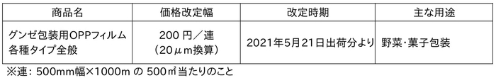 グンゼ株式会社(本社:大阪市北区、社長:廣地 厚)は、プラスチックカンパニーが販売する包装用OPP(二軸延伸ポリプロピレン)フィルムについて、2021年3月1日付で公表した価格改定に引き続き、新たに追加で価格改定を実施することを決定しましたので、お知らせいたします。
