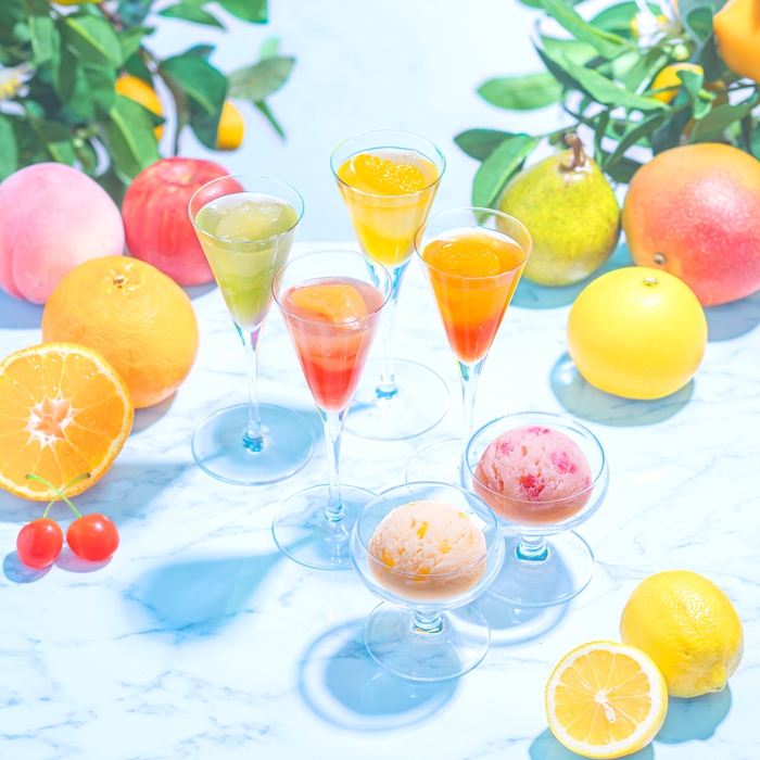 国産フルーツを2種使用し、ピューレと果肉が楽しめるジュレや、国産フルーツのピューレをさっぱりとしたヨーグルト味で仕上げた、凍らせて食べるソルベをご用意しました。