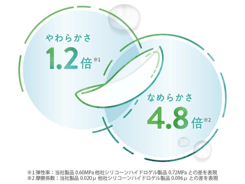 従来のシリコーンハイドロゲルレンズの弱点である硬さを軽減し、