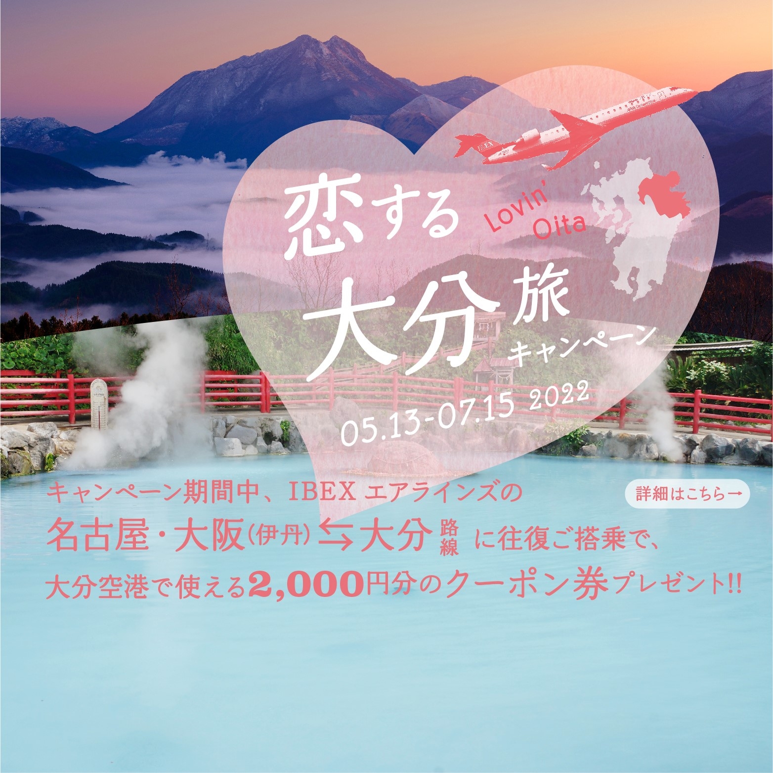 対象期間中、IBEX大分=大阪(伊丹)線/大分=名古屋(中部)線を往復でご搭乗の方へ【大分空港対象店舗で使用可能なクーポン券(2,000円分)】をお渡しします