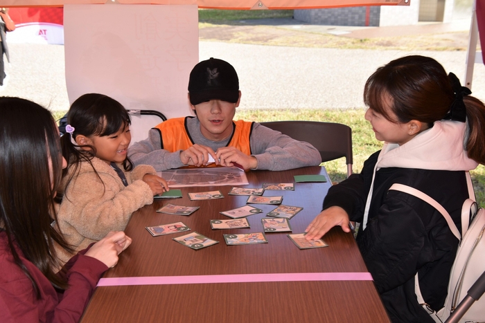 この日はゼミ生28人と損保ジャパンの社員5人が参加し、秋まつりが始まると親子連れらが次々とブースを訪れる盛況ぶり。「防災・減災かるた」では、机の上に取り札を広げて学生が読み札を読み上げると、子どもたちが一生懸命に取り札を探し、分からない子どもがいると学生が「これかな?」とサポートしたり、「火の元は落ち着いて確認しようね」などと取り札の内容を分かりやすく教えたりしました。
