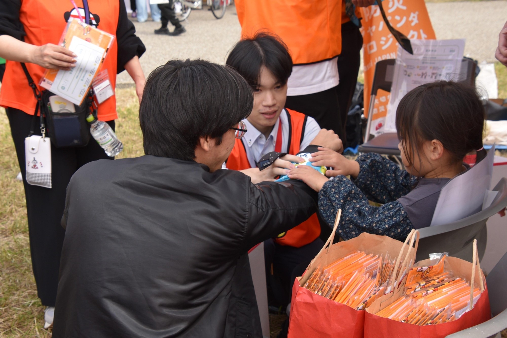 応急手当は、損保ジャパンの社員から事前に学んだ通り、バンダナで傷口を押さえてネクタイを巻いて固定する止血法と、新聞紙やネクタイ、レジ袋などを使って固定する骨折時の手当の方法を、学生たちが親子連れの目の前で披露したり、来場者にも体験してもらったりしました。参加した母親は「かるたは子どもには少し難しかったけれど、私はとても勉強になりました。このかるたが欲しいぐらいです」と喜んでいました。