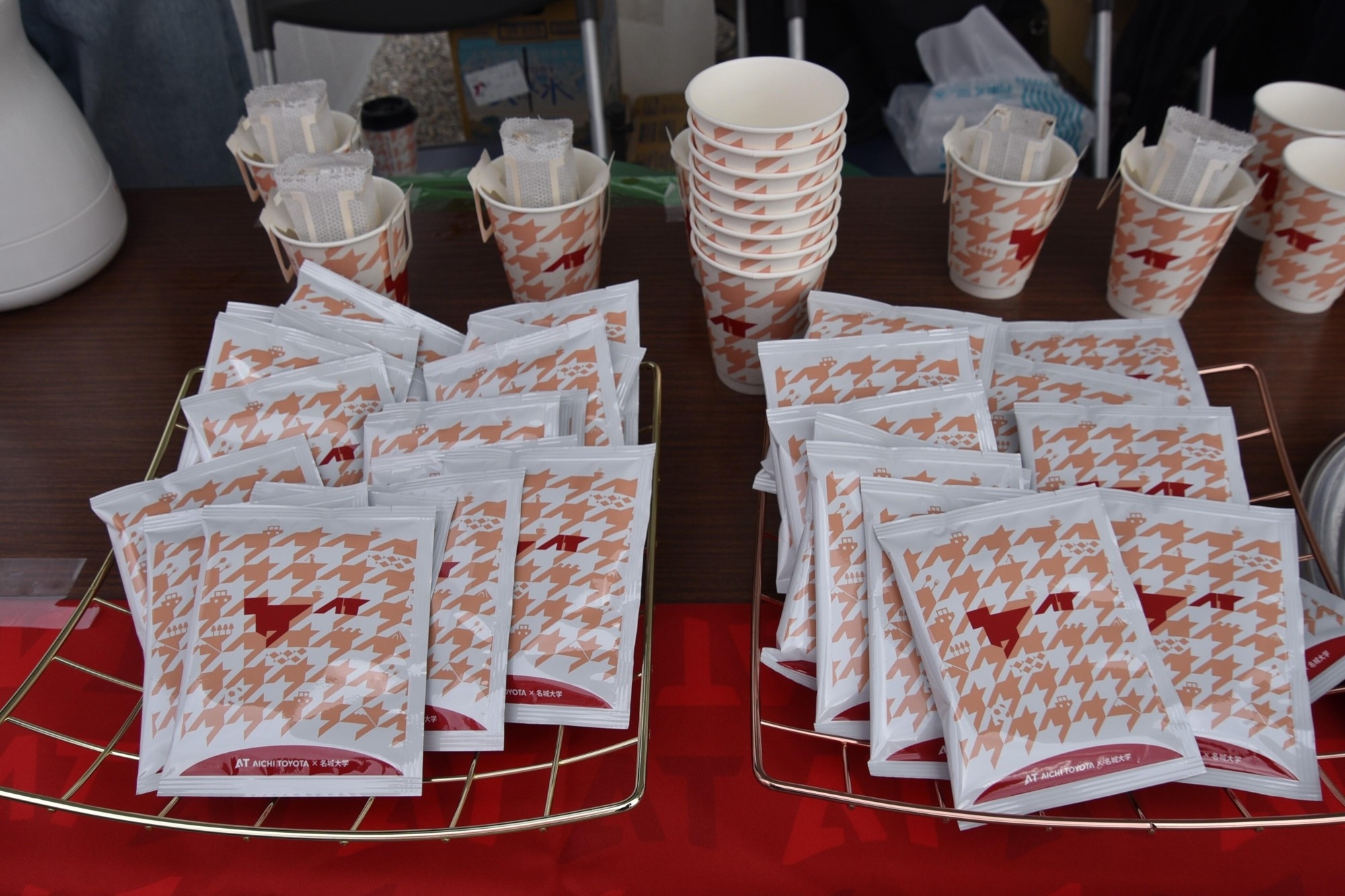 秋まつりの会場では、本学と産学連携協定を締結している「株式会社ATグループ」(本社・名古屋市昭和区)のブースも出展し、経営学部の澤田慎治准教授のゼミ生とコラボして開発したオリジナルのブレンドコーヒーを来場者に振る舞いました。ATグループのブースは相川ゼミのブースのすぐ隣になったこともあって「産学連携をアピールできるので」と担当者。250パックを用意し、来場者に「喜んでいただけました」と話していました。