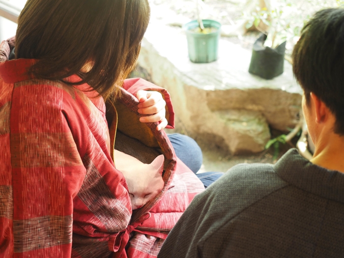 SNSでとあるお寺の投稿を見つけました。それはとても羨ましい光景で、住職の着物の懐に猫がぴったりと収まり、密着したまま気持ちよさそうに寛いでいるのです。その投稿を見た商品開発の担当者は思い立ちました。「そうだ!着物ではなくはんてんにすれば気軽に着られる。懐にポケットをつけて猫が入れるようにしよう」と。