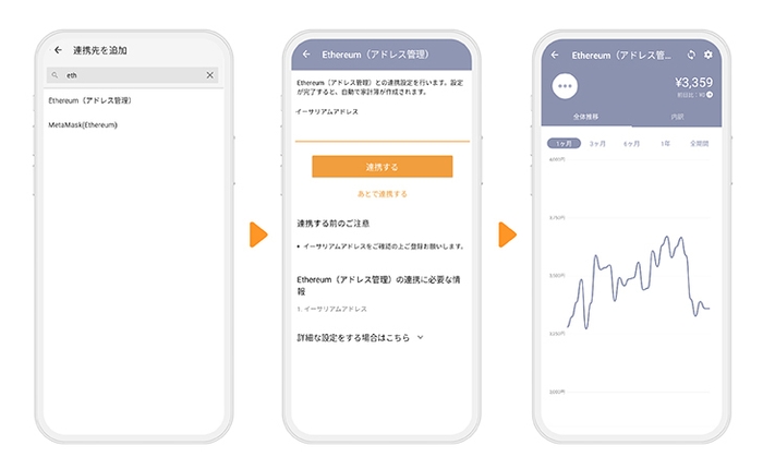 今回『マネーフォワード ME』と連携可能になるのは、「イーサリアム」「ポリゴン」のブロックチェーンウォレットです。これまで暗号資産取引所との連携は可能でしたが、新たに連携機能を開発し、ブロックチェーンウォレットのアドレスを『マネーフォワード ME』上に登録することで、直接の連携ができるようになりました。『マネーフォワード ME』と連携することで、ウォレット内で保有する暗号資産をグラフで見える化し、またその推移も簡単に確認することができます。