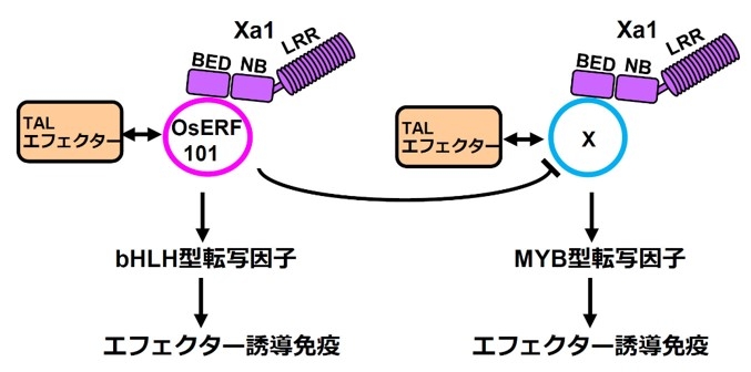 さらに、Xa1による免疫制御経路を解明するため、Xa1と相互作用する因子を探索し、「OsERF101」という転写因子※5 を発見し、OsERF101が、Xa1によるTALエフェクターの認識および免疫誘導において極めて重要な働きをしていることを明らかにしました。