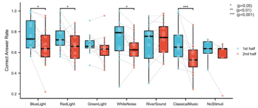 脳波信号の研究は数多くなされていますが、本研究は、集中を維持する方法を明らかにすることを目的として、視覚や聴覚などの異なるタイプの単一モーダル刺激の影響を特に複数回のテストを実施した場合で比較検証しました。今回、環境光よりも、背景音、特に聴覚刺激であるRiver Soundが、正答率を維持する影響があることが分かりました。人と環境の関係はまだ十分明らかになっているとは言い切れず、様々な評価を通して人の適応状態や感情を明らかにすることは重要な意義があります。引き続き、我々は社会に貢献する研究開発を推進していきます。