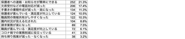 回答してくれた約86%の施設が「保護者への連絡・お知らせが簡単にできる」、約70%の施設が「欠席受付などの電話対応が減った」という結果になりました。