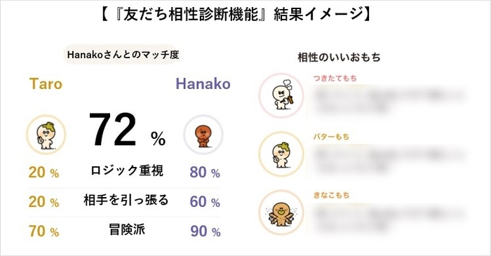 「omochi」では、友だちと一緒にバイト・インターン探しをお楽しみいただくために、新たに「友だち相性診断機能」を搭載いたしました。「友だち相性診断機能」では、それぞれのキャラ診断の結果から、友だちとのマッチ度(相性)を算出し提示するほか、相性の良いキャラ上位3つをお知らせします。