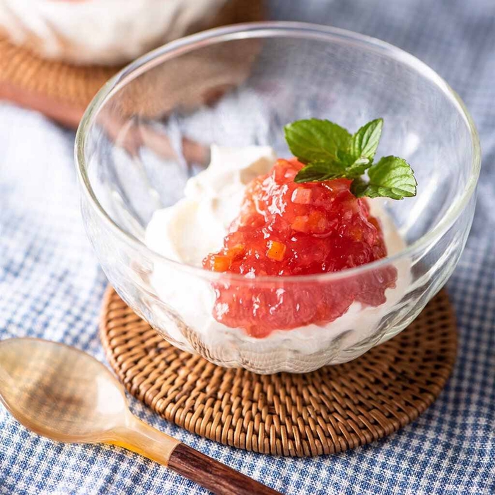 真っ赤なマーマレードは食卓に添えるだけで、一気に夏らしさを演出してくれます。パンやヨーグルトはもちろん、レアチーズケーキのトッピングにしていただくのもおすすめです。マーマレードのみずみずしい酸味が、コクのあるチーズのおいしさを引き立ててくれますよ。