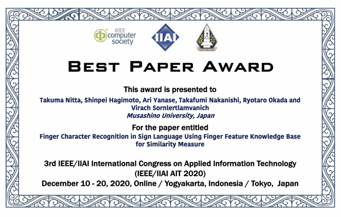 武蔵野大学(東京都江東区)データサイエンス学部データサイエンス学科2年生の新田 拓真(にった たくま)さん、萩本 新平(はぎもと しんぺい)さん、柳瀬 愛里(やなせ あり)さんが国際学会IEEE/IIAI International Congress on Applied Information Technology (以下:IEEE/IIAI AIT 2020)にて論文発表を行い、上位2位までに授与されるBest Paper Awardを受賞しました。